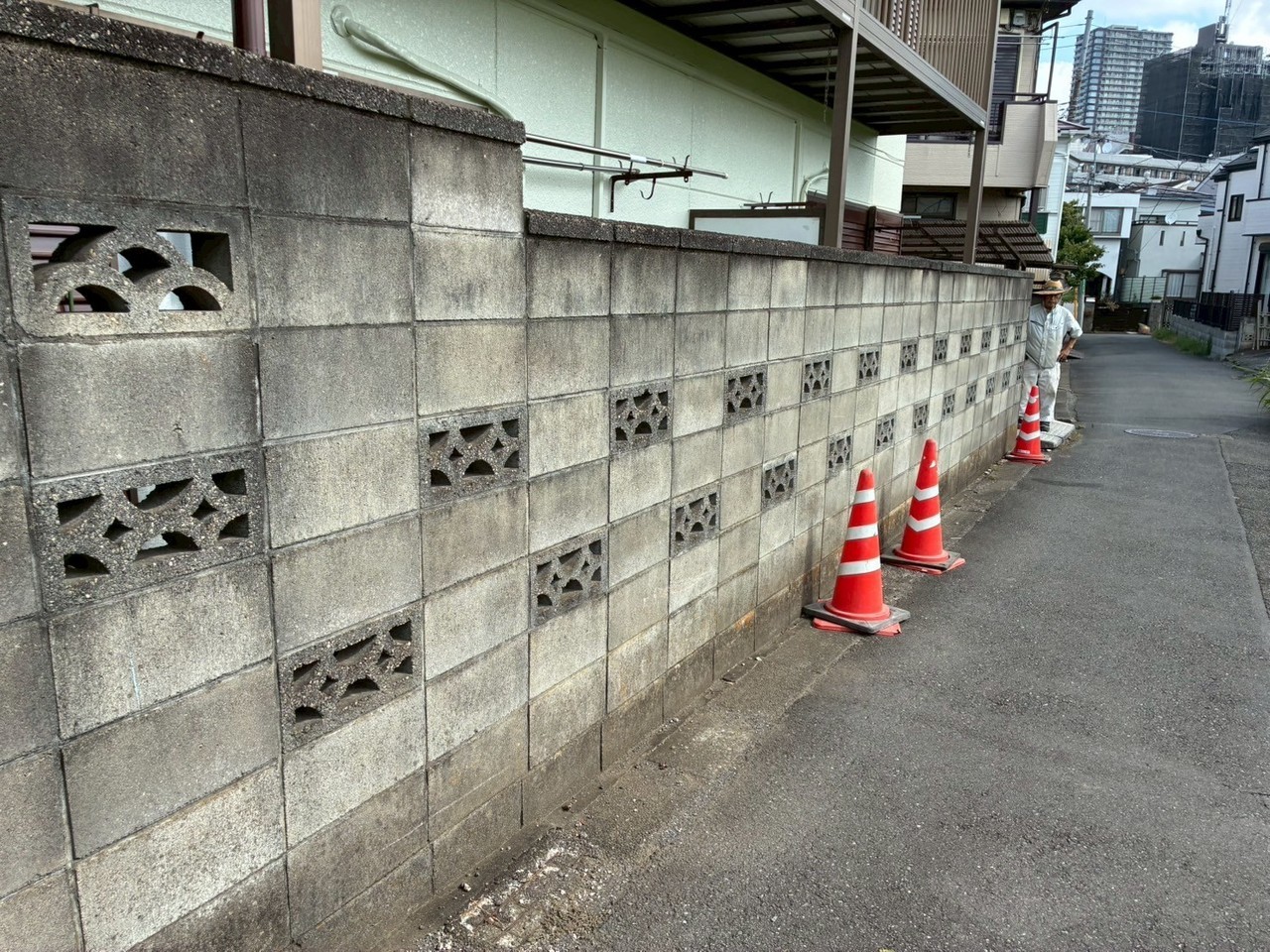 既存のブロックと擁壁を解体し、新たにブロックを積み直しました。